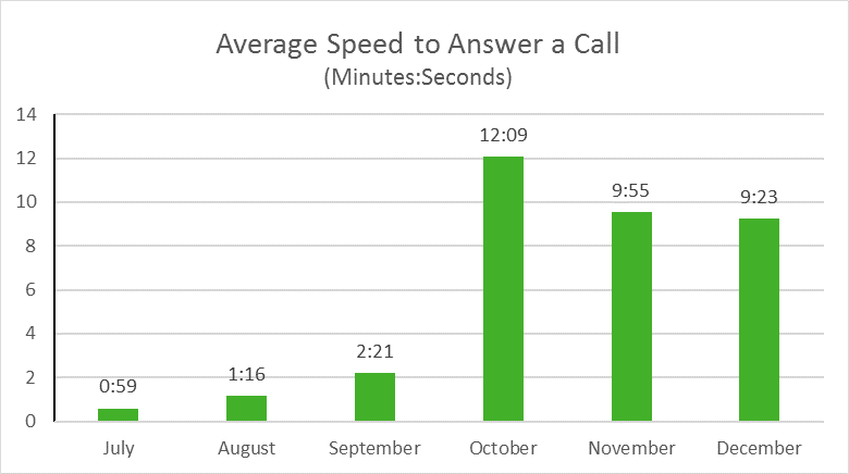 The average speed to answer a call to 855-RIV-LINK is declining this month as additional customer service representatives are added and call volumes continue to decrease. After significant improvements this summer, the average time to answer a call to RiverLink customer service increased in the fourth quarter. The average time to answer a call was less than a minute in June and July and just over a minute in August.