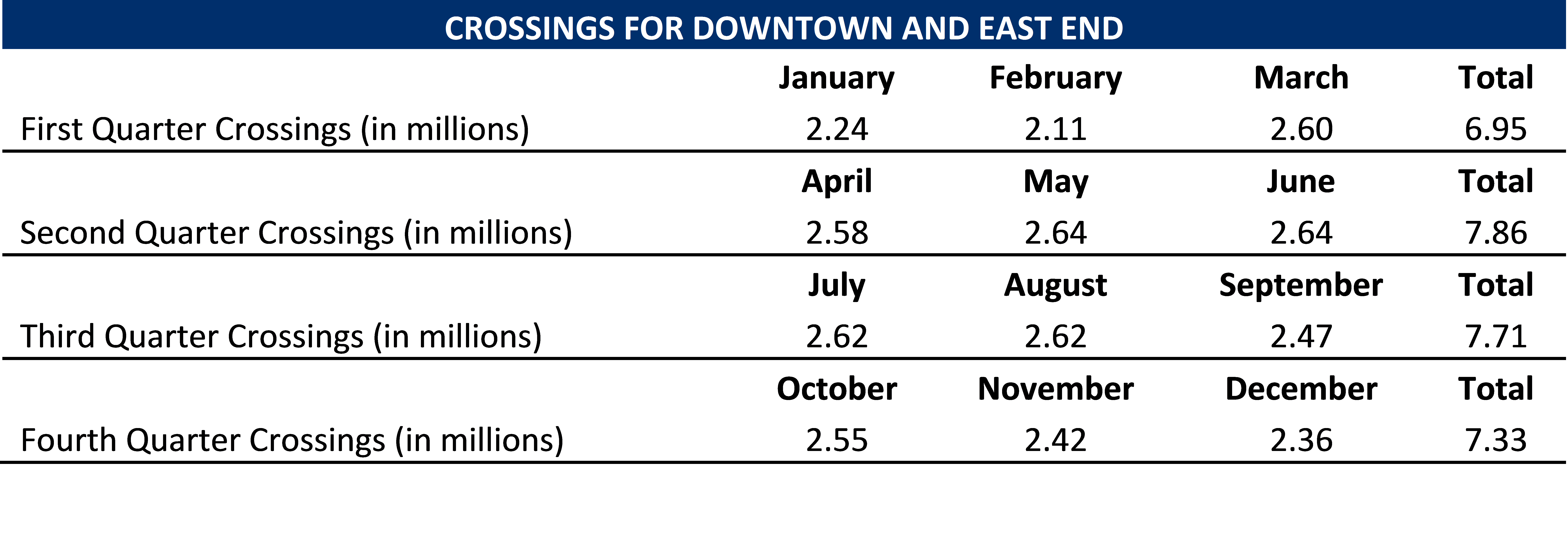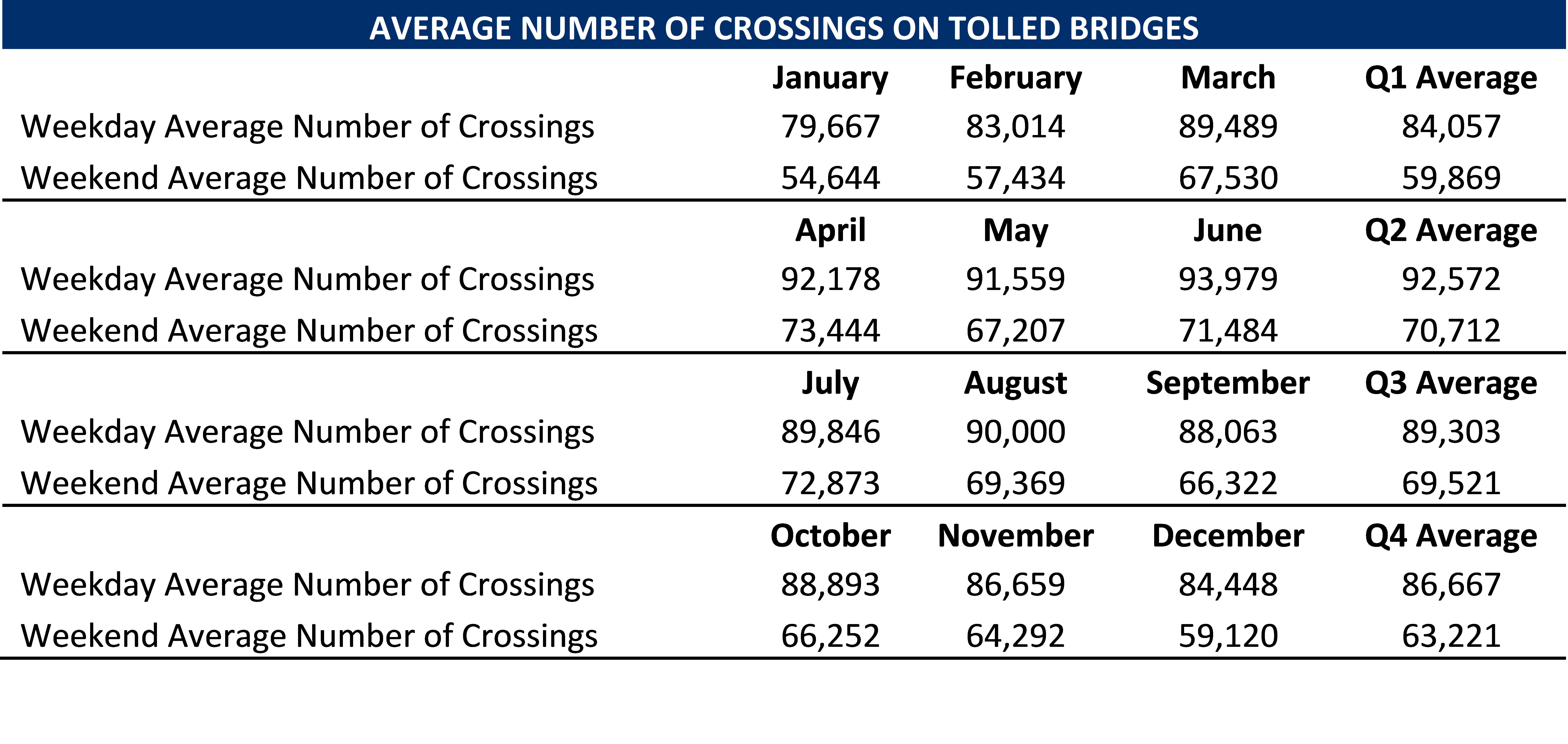 Steady crossings were seen again in the fourth quarter. There were 7.3 million crossings on the three tolled bridges in the fourth quarter of 2017. As expected, the summer travel months saw the most crossings of the tolled bridges.