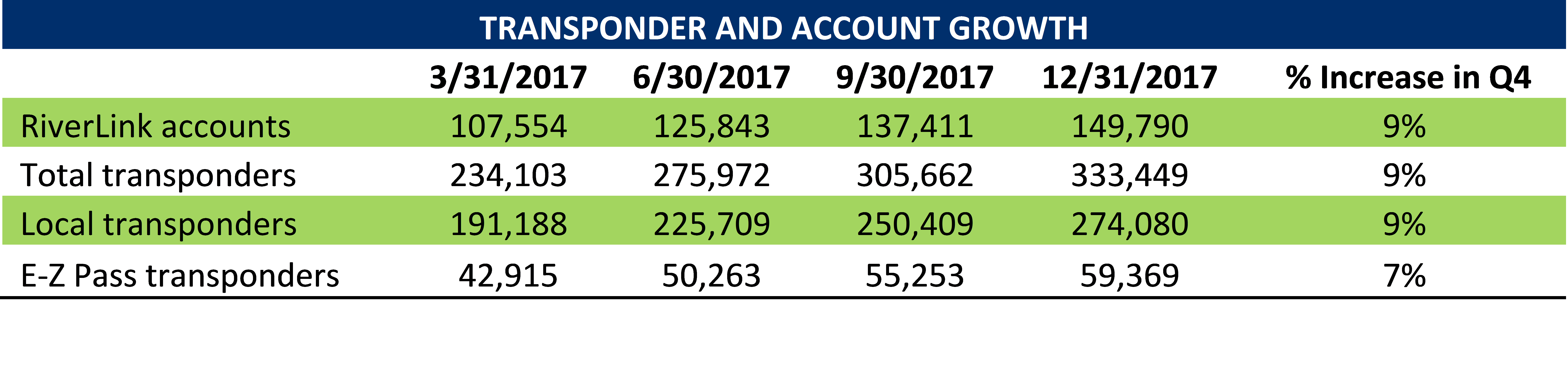 The number of RiverLink prepaid accounts increased nearly 10 percent in the fourth quarter to nearly 150,000 accounts. Nearly 335,000 transponders were requested in the first year of tolling.