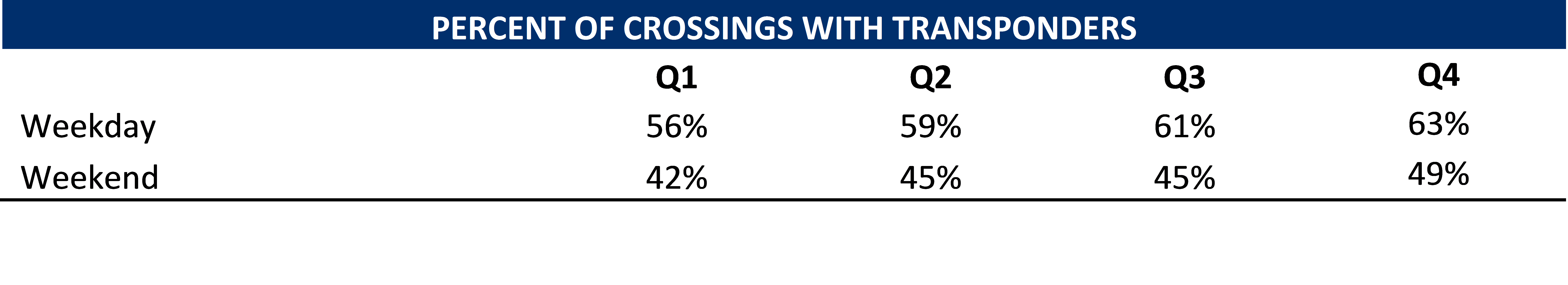 The number of drivers crossing tolled bridges with transponders increased two percentage points from the third quarter to 63 percent in the fourth quarter.