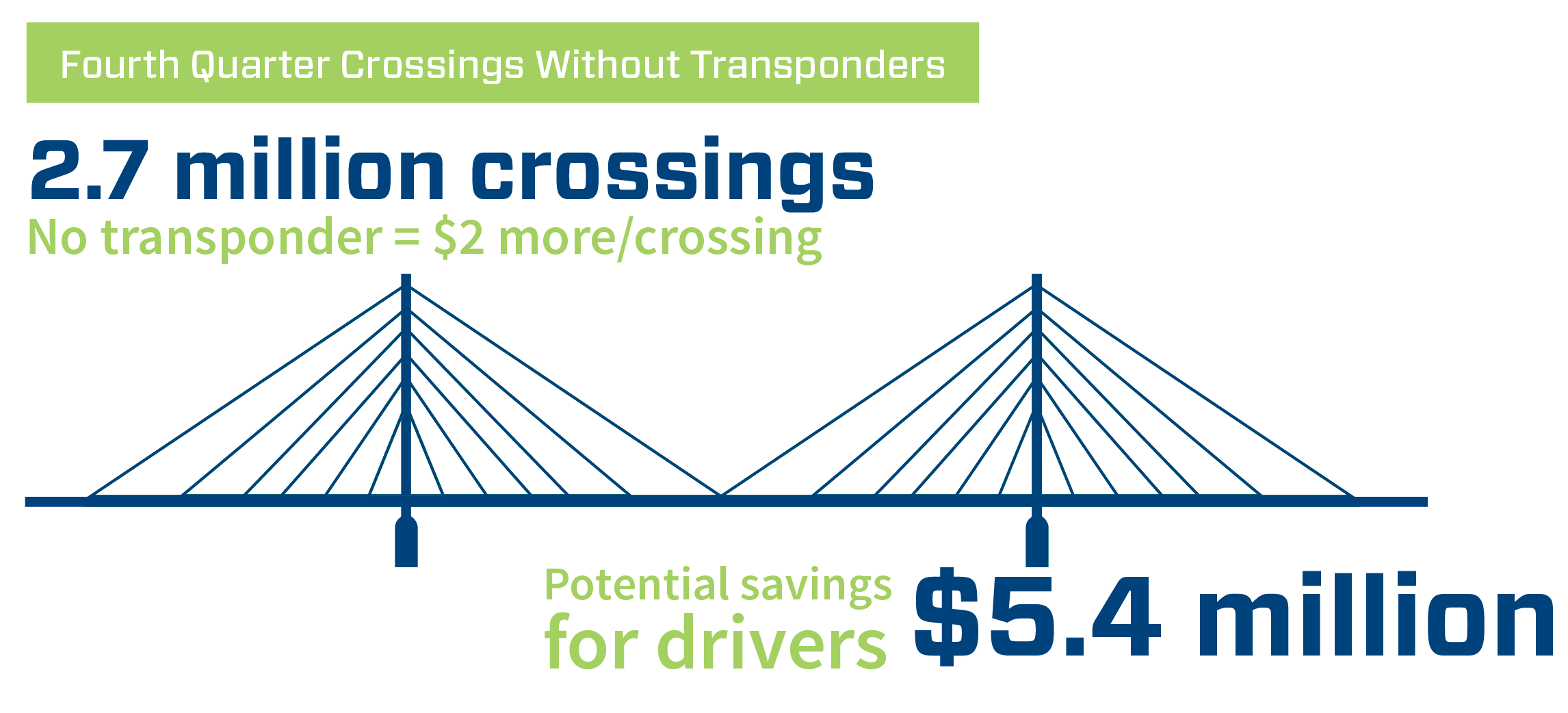 In the fourth quarter, 2.7 million crossings were made without a transponder. A driver saves $2 per crossing when using a prepaid account and transponder. Drivers could have saved $5.4 million with prepaid accounts and transponders.