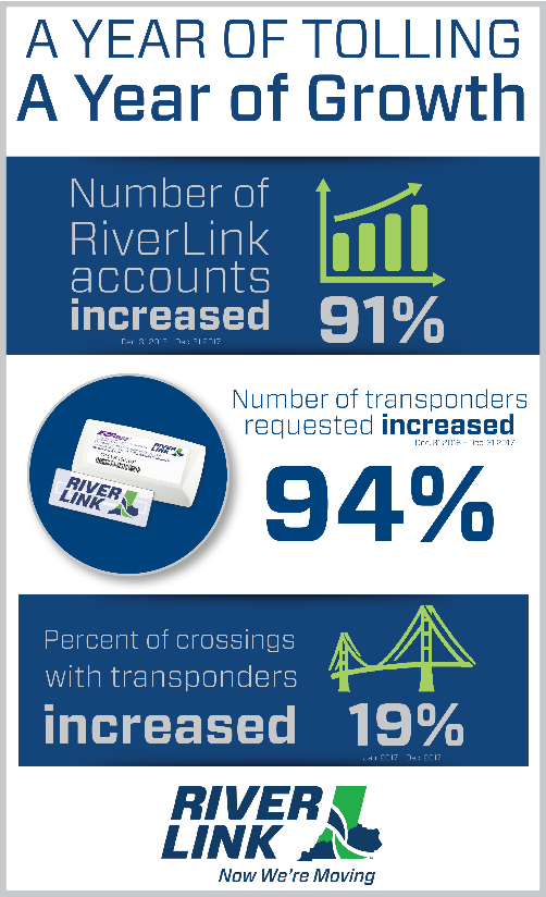 The first year of tolling on three bridges connecting Louisville and Southern Indiana saw significant growth in the number of RiverLink prepaid accounts and the number of RiverLink transponders requested. Nearly 150,000 RiverLink prepaid accounts were opened in the first year of tolling and nearly 335,000 transponders requested.